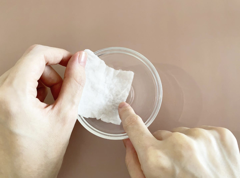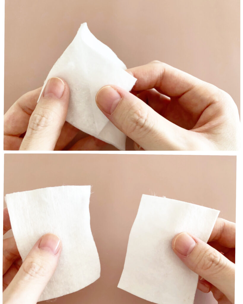 ①コットンはこのように2枚に割いたものを使うとよりお肌に密着しやすいです。