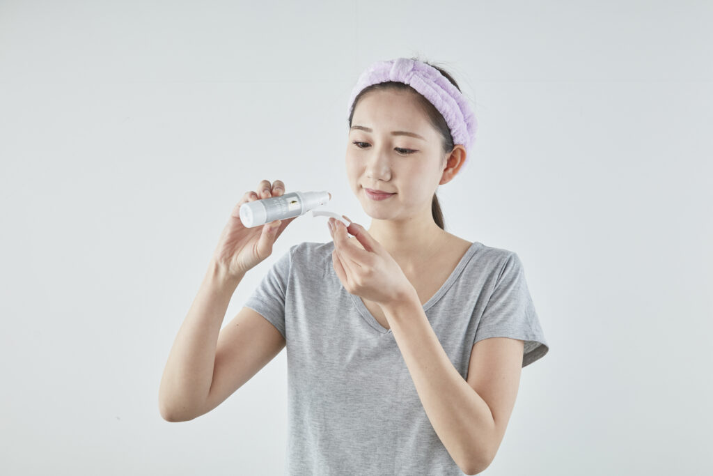 1. クレンジング、洗顔後にケアナキレイをコットンに3〜5プッシュ含ませ毛穴汚れの気になる部分に密着させるようにのせます。